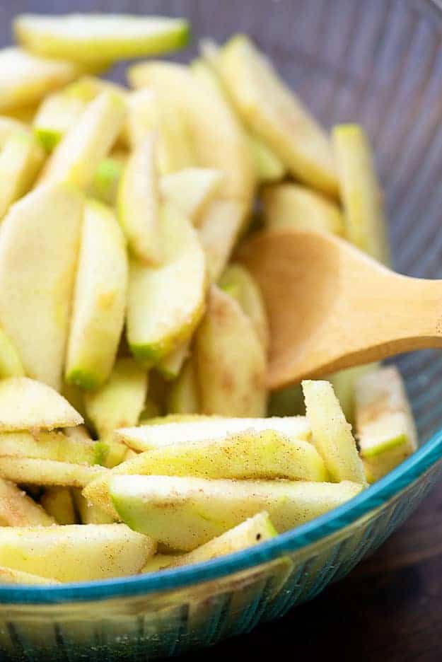 Peel and slice your apples and then toss them in some sugar and cinnamon. I’m using a 1/2 cup of sugar, but I recommend tasting your apples before you add the sugar. You can absolutely reduce or increase it based on how sweet/tart your apples are. And keep in mind that the topping is sweet too, so don’t overdo the sugar. 🙂