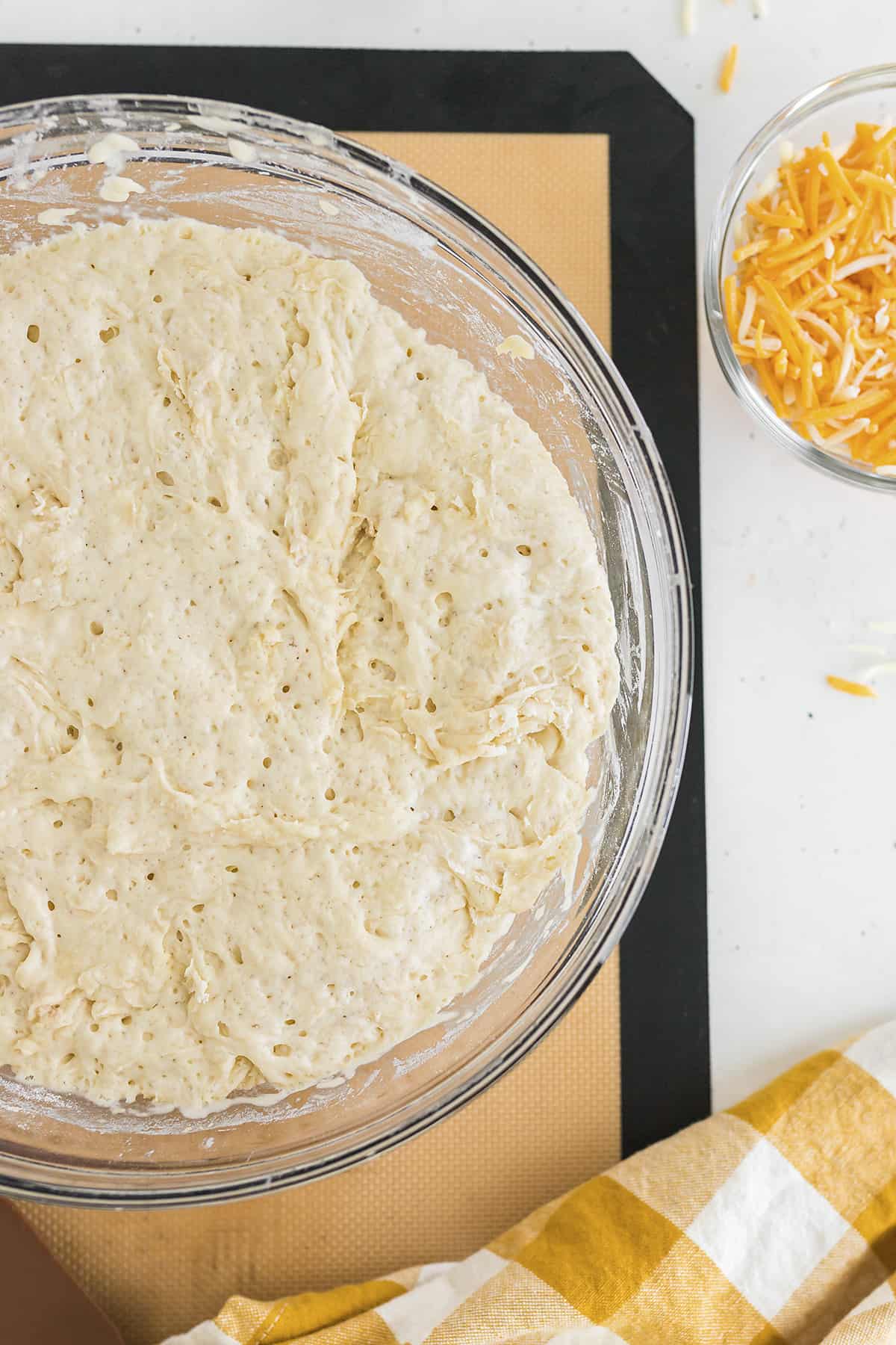 - Once dough has doubled in size, remove plastic wrap. Add in jalapenos and most of the cheddar cheese (leave a little for sprinkling over the top of the dough). Dump dough onto a floured surface.